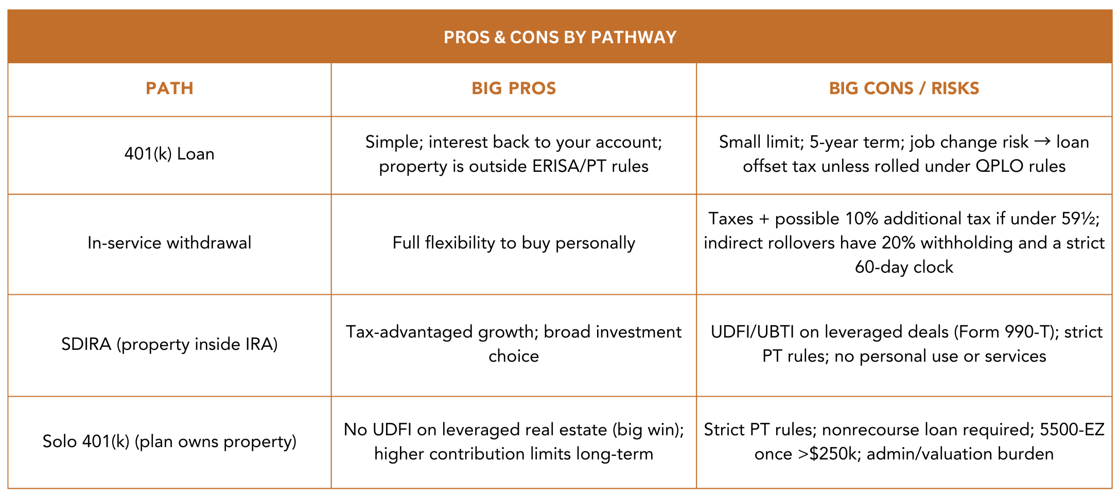 Using retirement dollars to acquire real estate can work—but only if you choose the right pathway and follow the tax and ERISA rules exactly. Below is a practical, detailed guide to four common paths, the key legal guardrails, step-by-step mechanics, and the pros/cons of each.